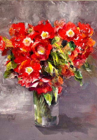 Rose Eyepaint in real life and in my paintings. Clockwise from upper left: Eyepaint trained to form an arch; Oil painting "Summertime": Eyepaint roses in a vase on my stovetop; Oil painting "Wild Roses"